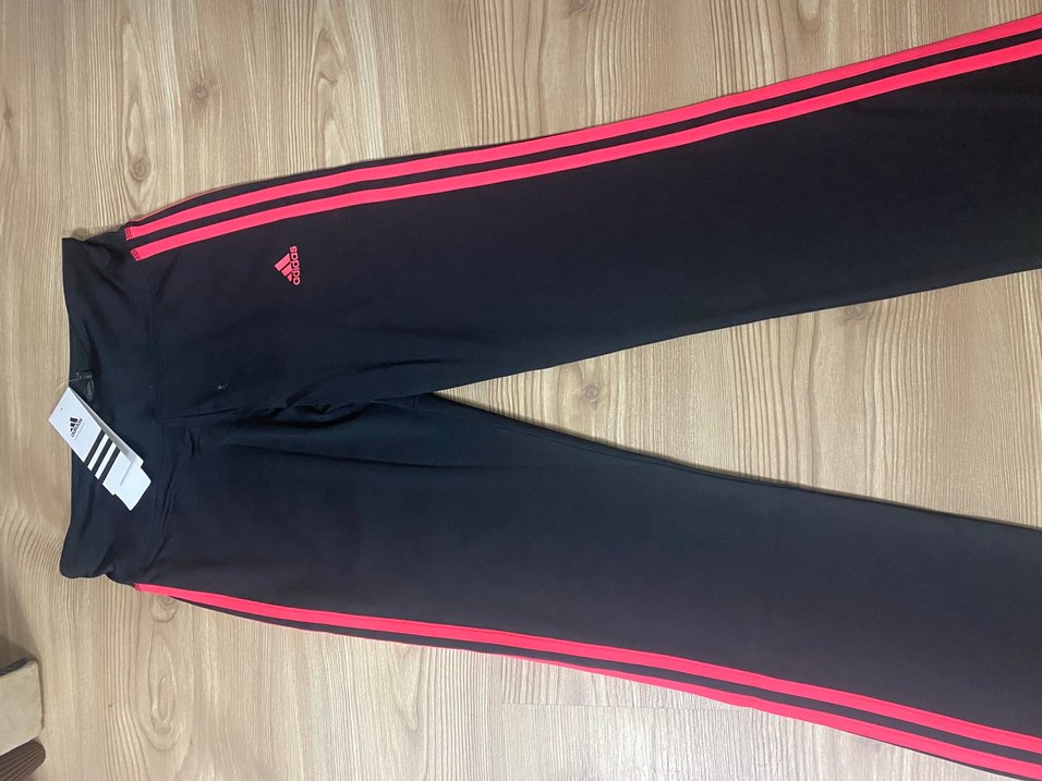 Sıfır kullanılmamış 95 cm uzunluk 18 cm paça genişliği 32 cm Esnek bel sentetik kumaştan, pembe şeritli siyah kadın eşofman altı. Spor ve sokak tarzı için uygundur.