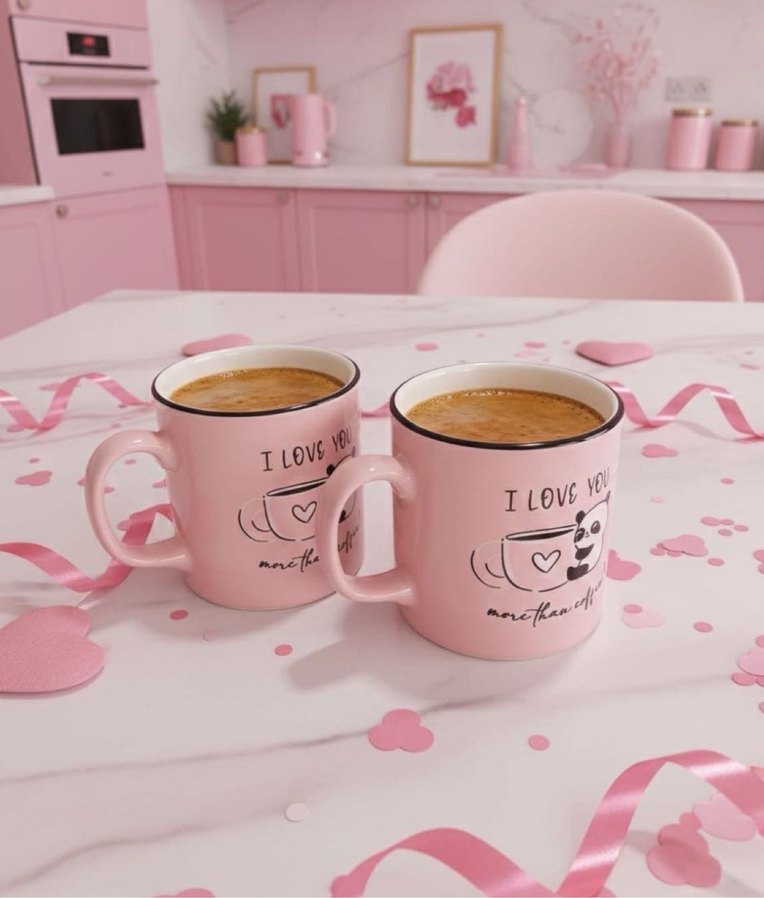 "I LOVE YOU" yazılı ve sevimli desenli, pastel pembe seramik iki kupa, kahve keyfi için uygun. ☕