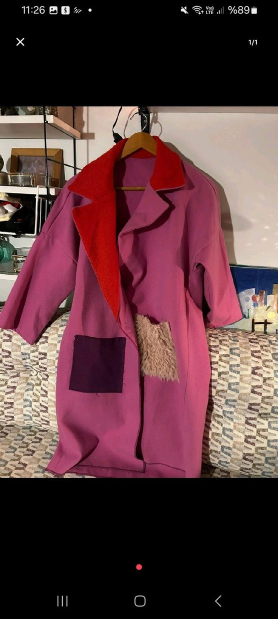 Pembe pastel tonlarında, uzun ve bol kesim Kaban. Yaka ve cep kısmında kürk detayları bulunur, günlük rahat kullanım için uygundur.