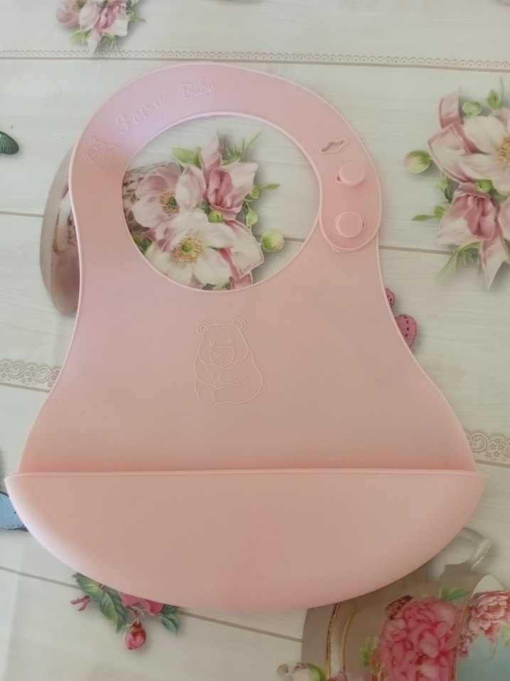 Pastel pembe silikon bebek mama önlüğü, ayarlanabilir boyun kısmı ve döküntüleri yakalayan geniş cep içerir.