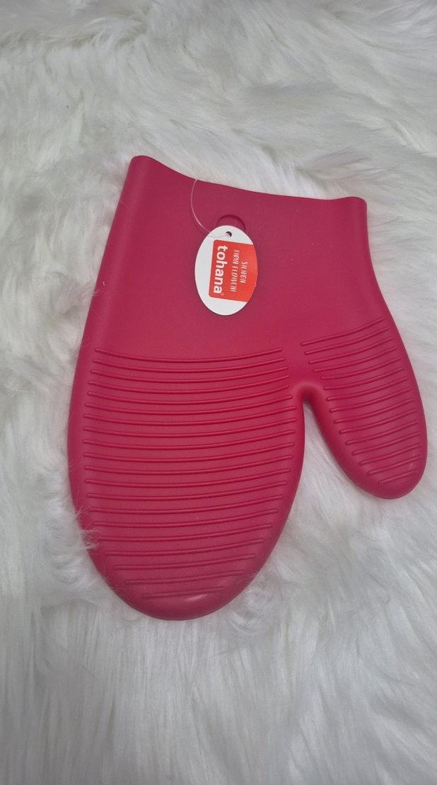 Pembe silikon fırın eldiveni, tutuşu artıran çizgili dokusu ile. Isıya dayanıklı ve esnek yapıda, mutfakta güvenli kullanım sağlar.