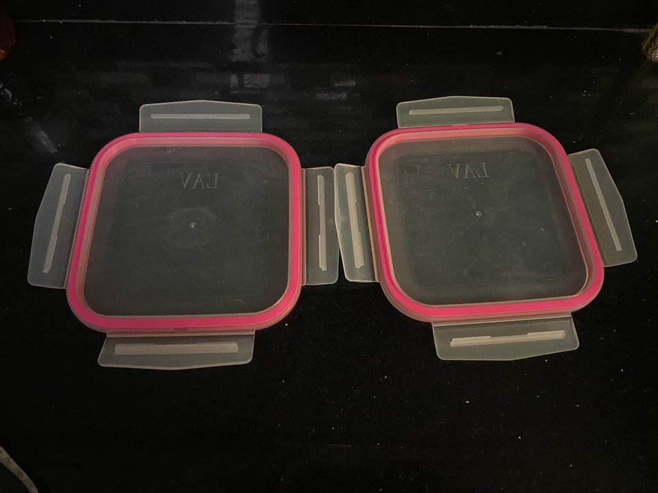 Farklı boylarda, pembe silikon kapaklı koyu renk plastik saklama kabı kapağı seti.