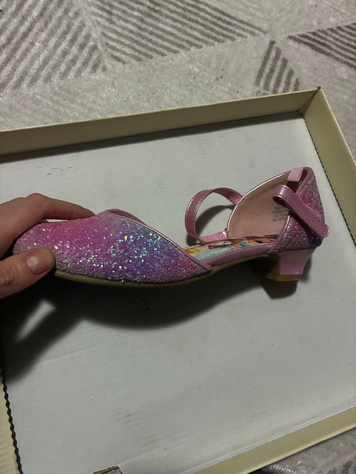 Pembe renkli, simli ve bağcıklı bilekten bantlı kız babeti, renkli batik deseni ve düşük topukludur.