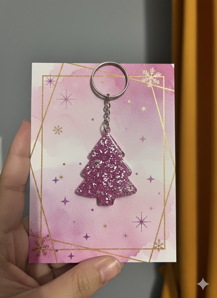 Simli, pembe çam ağacı şeklinde, parlak ve bohem tarzda rahat bir anahtarlık.