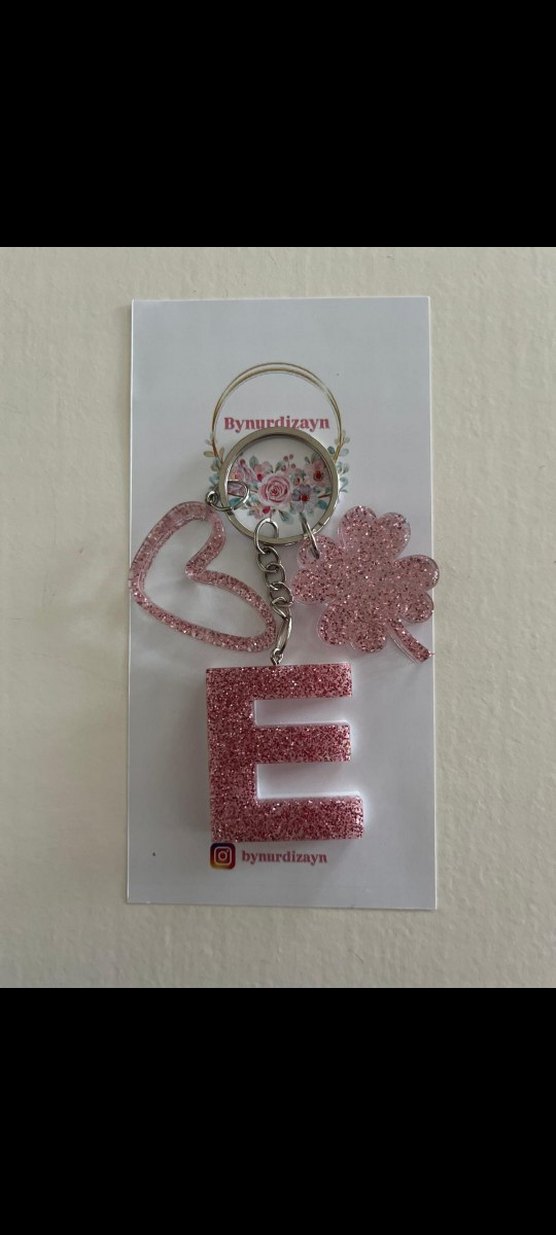 Pembe simli kalp, çiçek ve E harfi detaylı, zincirli bohem tarzda anahtarlık. Rahat ve renkli tasarım.
