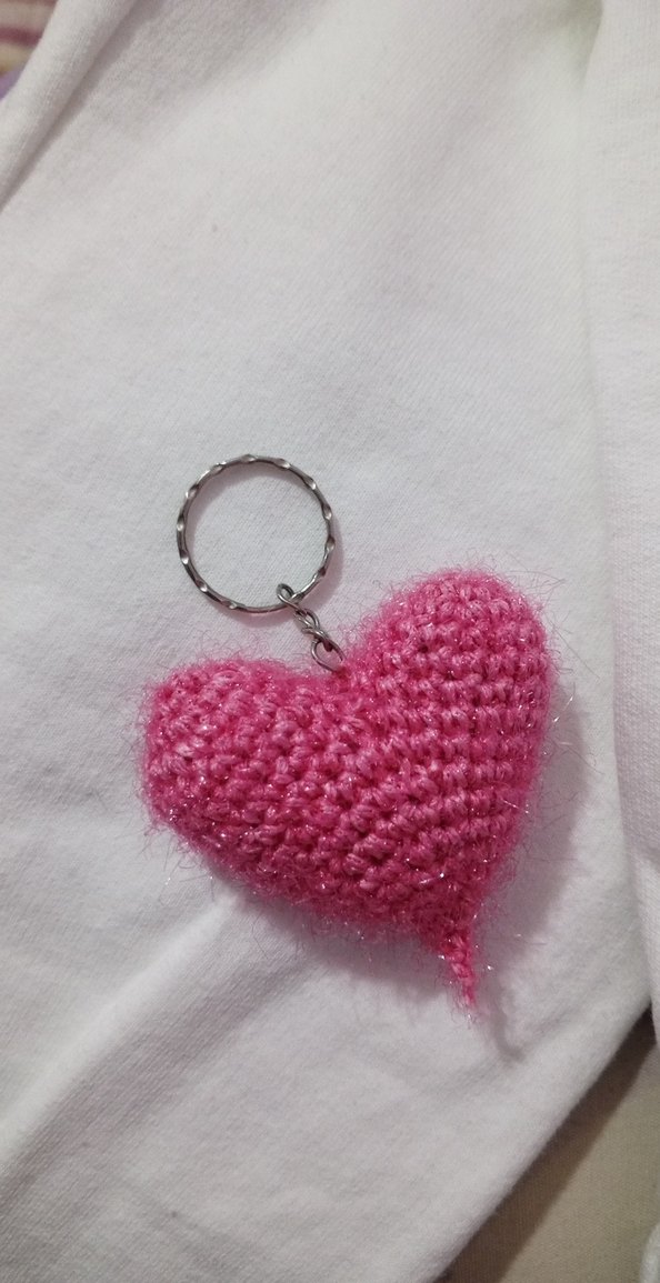 Renkli pembe kalp şeklinde, örgü ve rahat bir anahtarlık. Bohem tarzına uygun.