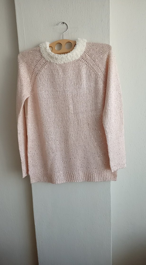 Pembe renkli, tüylü yakalı ve uzun kollu kadın kazak. Bol kesim ve sade, pastel tasarımıyla günlük kullanıma uygundur. boy 67cm iki koltuk arası 45cm