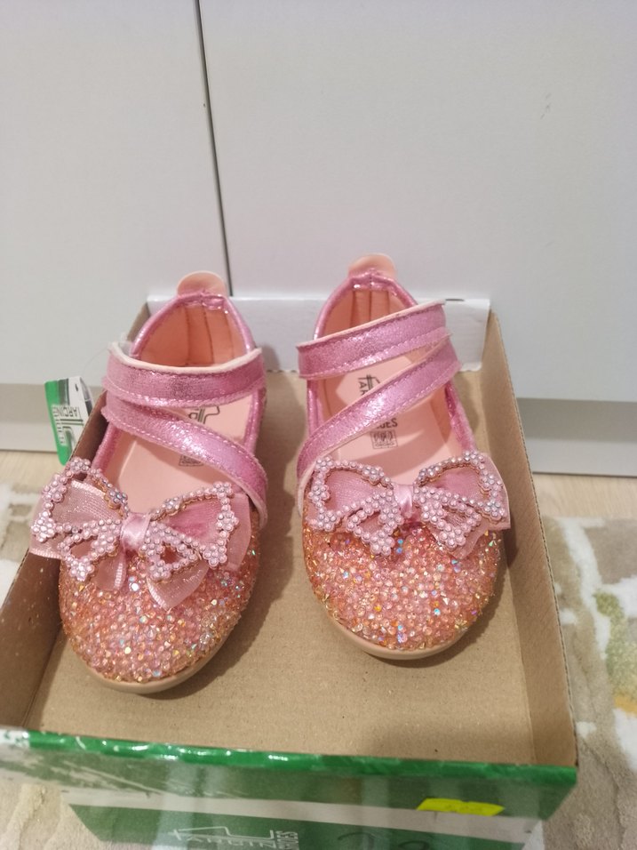 Pembe simli ve fiyonk detaylı, rahat kauçuk malzemeden yapılmış kız çocuk babet ayakkabısı. Trend sokak stili için uygundur. hiç kullanilmamistir