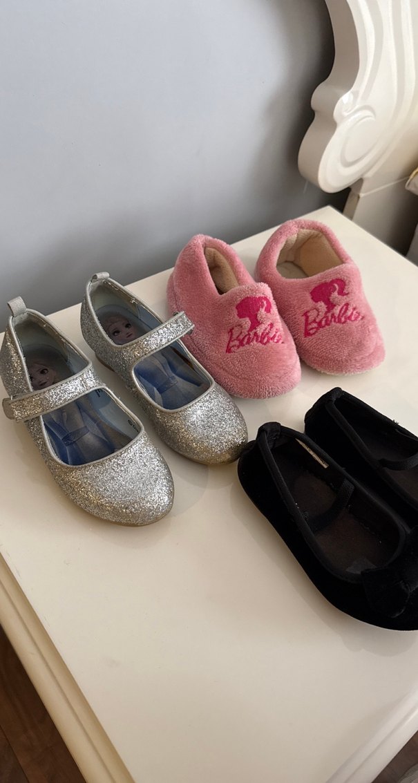 27 numara Simli topuklu önlerinin simi gitmiş. Siyah babet 26numara kurdelesi çıkıkhafif Pembe evayakkabısıda 26numara resimde gözüktüğü gibi