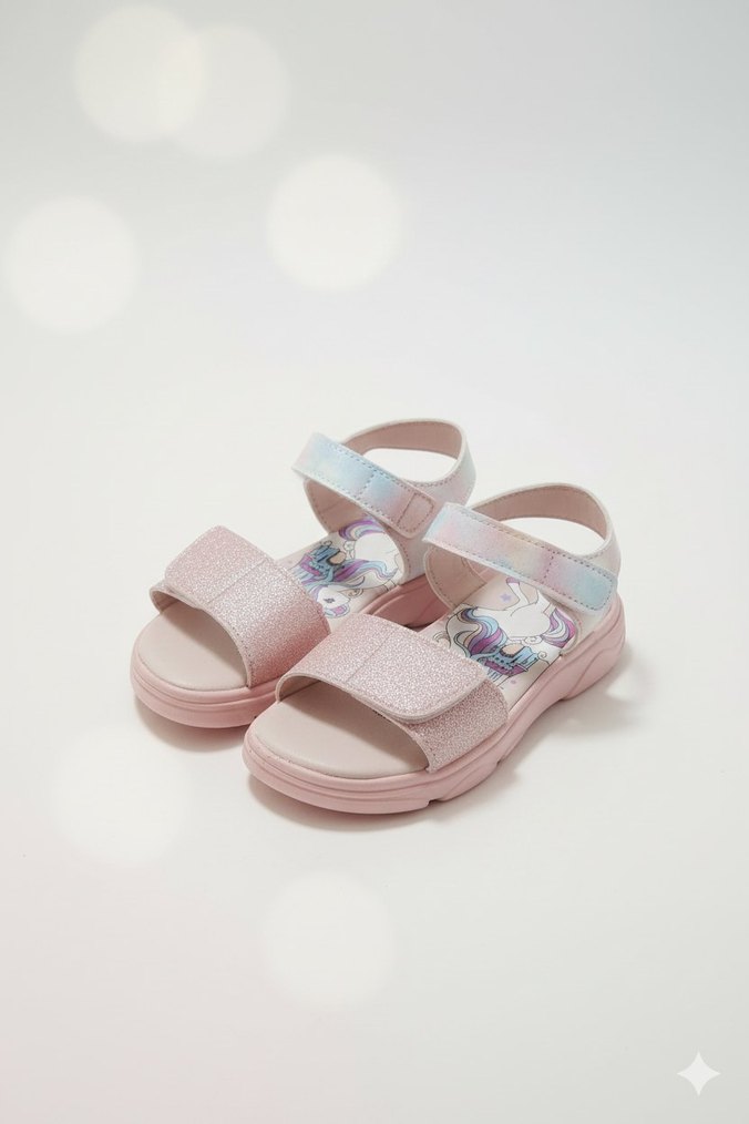 Pastel pembe renkli, simli kız çocuk sandaletleri. Kauçuk malzemeden, bağcıksız ve ayarlanabilir bantlı, bağdaşım desenli tabanıyla sokak modasına uygun.