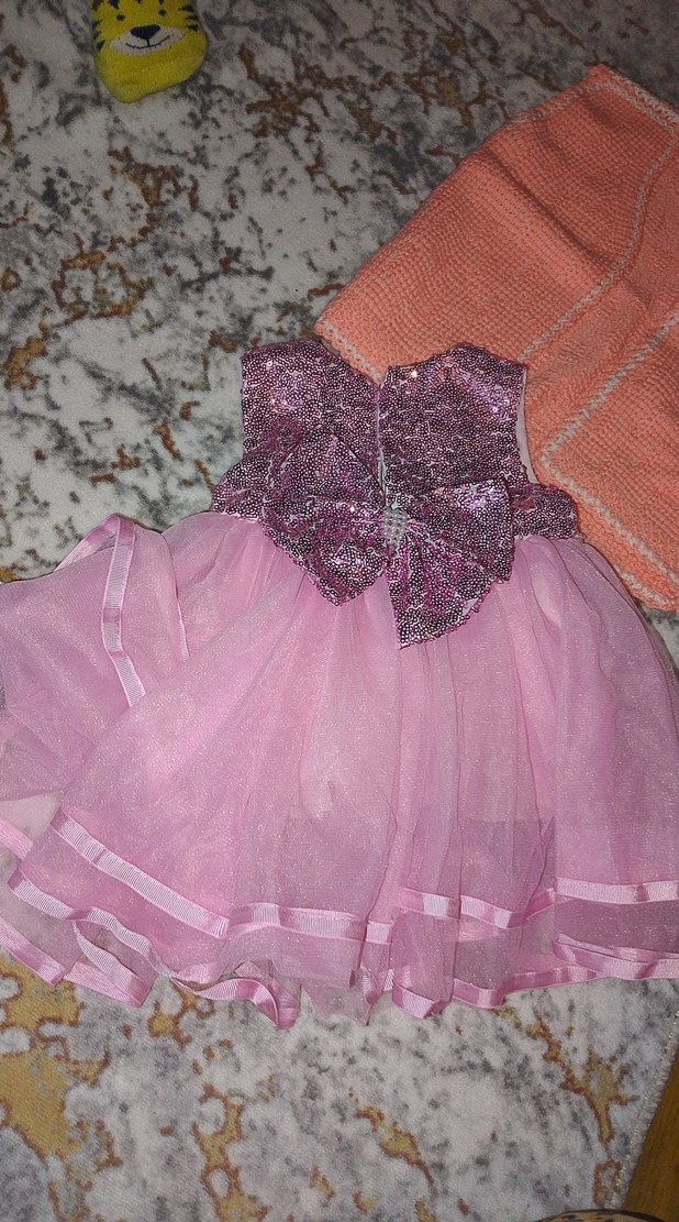 Simli üst kısmı ve parlak, yumuşak kumaş etek kısmı olan pembe kolsuz kız çocuk elbisesidir. Askısız yakaya ve bohem tarzına sahiptir.