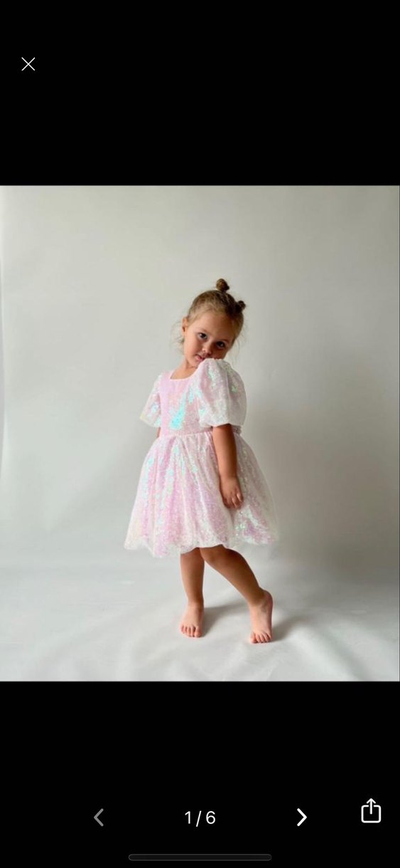 Pembe pullu simli, kısa kollu, bol kesim çocuk elbisesi.