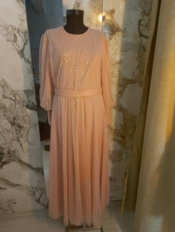 Pembe Simli Tesettür Uzun Abiye Elbise