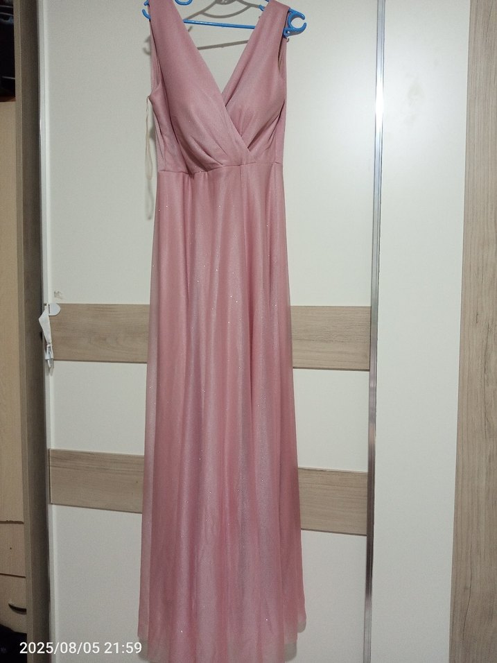 Pembe renkte, uzun ve drapeli tasarıma sahip, V yakalı ve ince askılı klasik şık abiye elbise. Düğün için uygun, pastel tonlarda modern klasik tarzda.