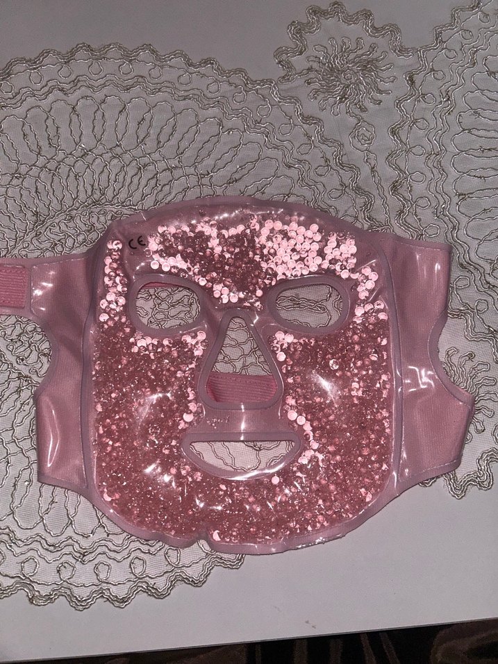 Pembe simli, göz, burun ve ağız için kesiklere sahip yüz maskesi. Parlak yüzeyi ve içindeki simlerle cilt bakımına uygundur. ✨ 1 kere kullanıldı
