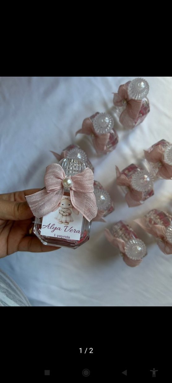 Pastel pembe cam şişeler, kurdele ve "Alya Vera" yazılı kişiye özel etiketle süslenmiştir. Özel günler için uygun.