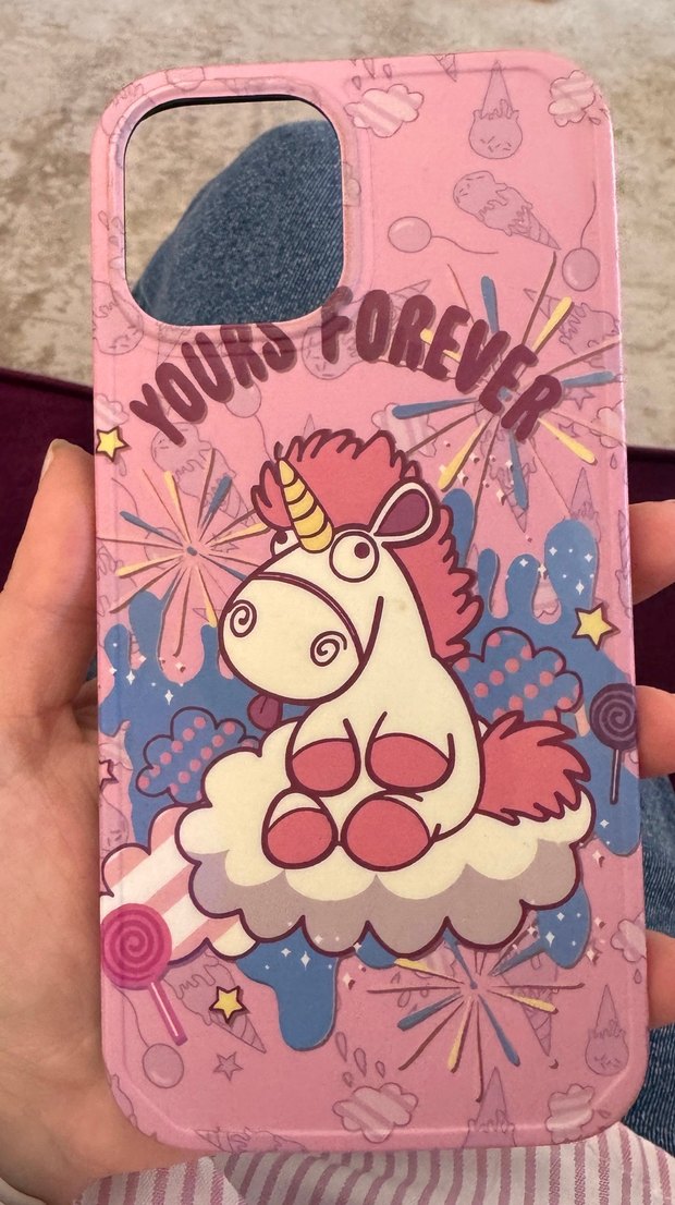 Pembe pastel renkte, şişkin unicorn desenli "Yours Forever" yazılı telefon kılıfı. Renkli pop kültür ögeleriyle yumuşak ve eğlenceli tasarım.