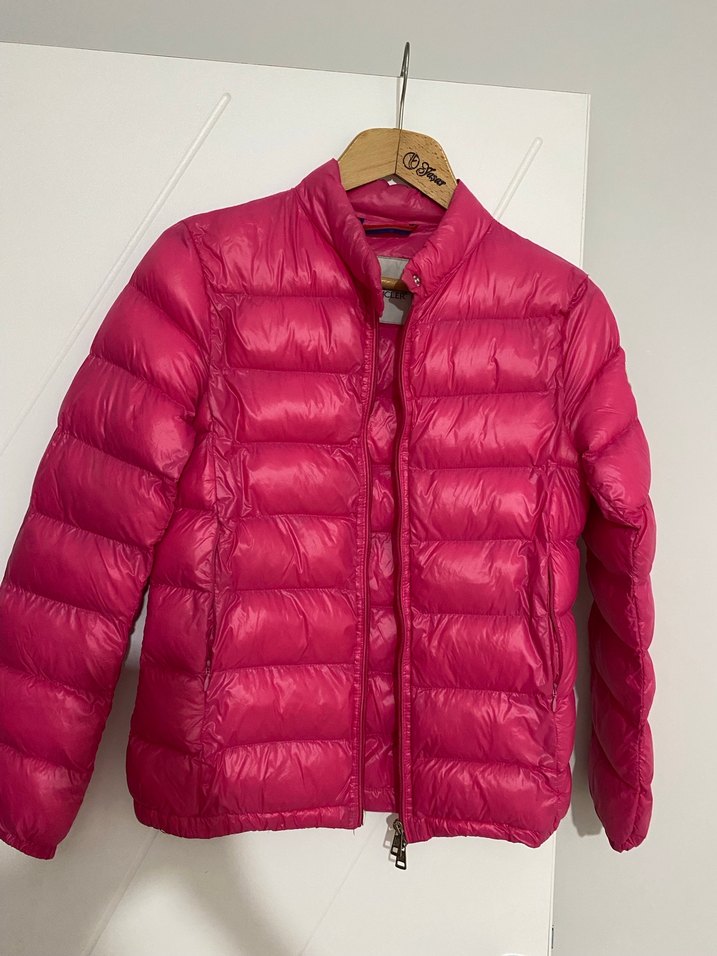 Fermuarlı, parlak pembe sentetik kumaştan, uzun kollu, bisiklet yaka, normal midi uzunlukta, dar kesim kadın mont. Trend sokak tarzına uygun.