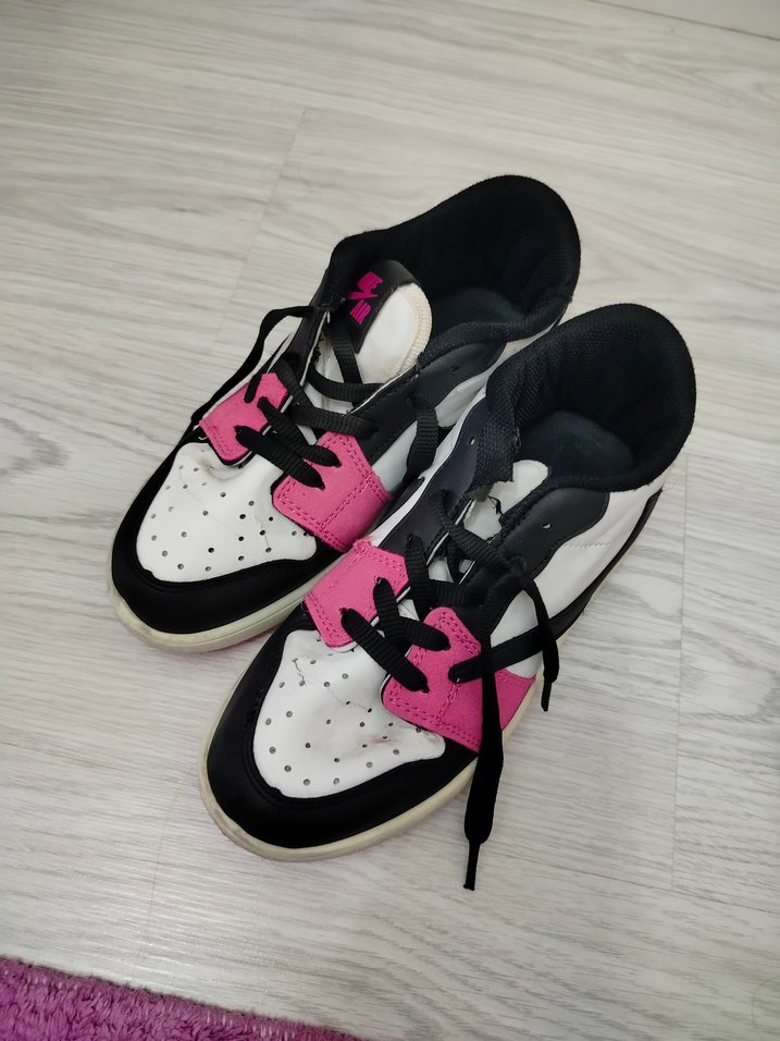 Pembe ve siyah renkli bağcıklı, bağcıklı spor ayakkabılar, şehir stili ile sportif rahatlığı bir arada sunar, markası Nike.