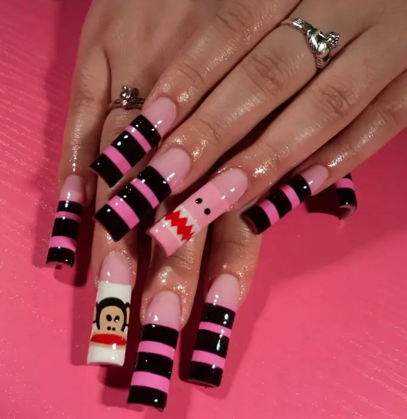 Pembe ve siyah çizgilerle süslenmiş tırnaklar, eğlenceli karakter desenleri içerir. Cesur ve yaratıcı bir görünüm için uygundur. 12 adet, 10 ana ve 2 yedek tirnak olarak gonderimi saglanir paket iceriginde kendi yapistiricisi da bulunmakta baska urunler icin sayfami ziyaret edin