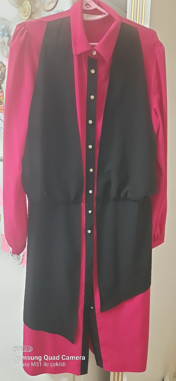 Uzun, düğmeli, bol kesim.Pembe ve siyah renklerde, gotik tarzda, ofis için uygun. Sentetik kumaştan, uzun kollu ve desensiz.