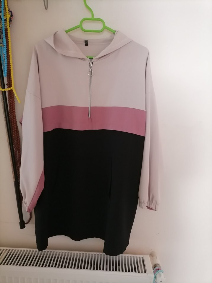 Kadınlar için bol kesim, uzun kollu, bisiklet yaka sweatshirt. Fermuarlı, pastel pembe ve siyah renk bloklu, sentetik kumaştan yapılmıştır. Ürün takımdir