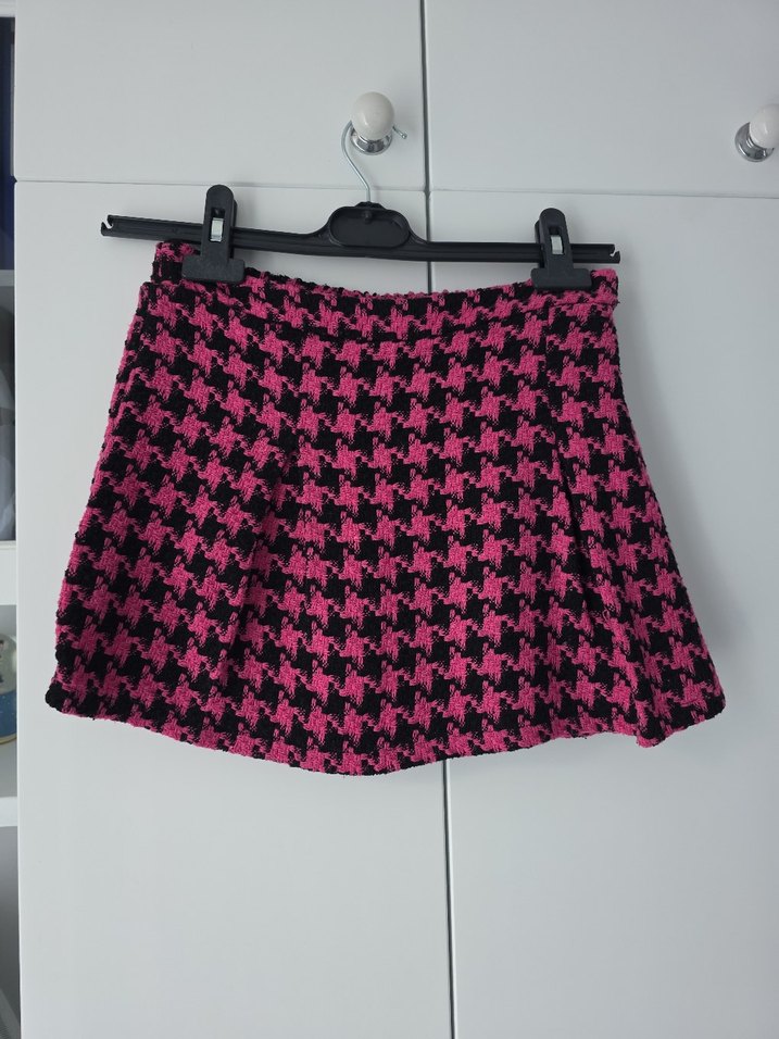 Pembe ve siyah kazayağı desenli, kemerli ve dar kesim mini etek. Sentetik kumaştan yapılmıştır, günlük sokak stiline uygundur.