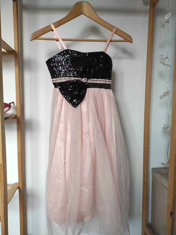 6-7 yaş uyumlu.. İnce askılı, straplez yaka ve drape detaylı kız elbisesi. Siyah payetli üst kısmı, pastel pembe yumuşak dokulu eteğiyle kontrast oluşturur. Gotik ve moda tarzında..