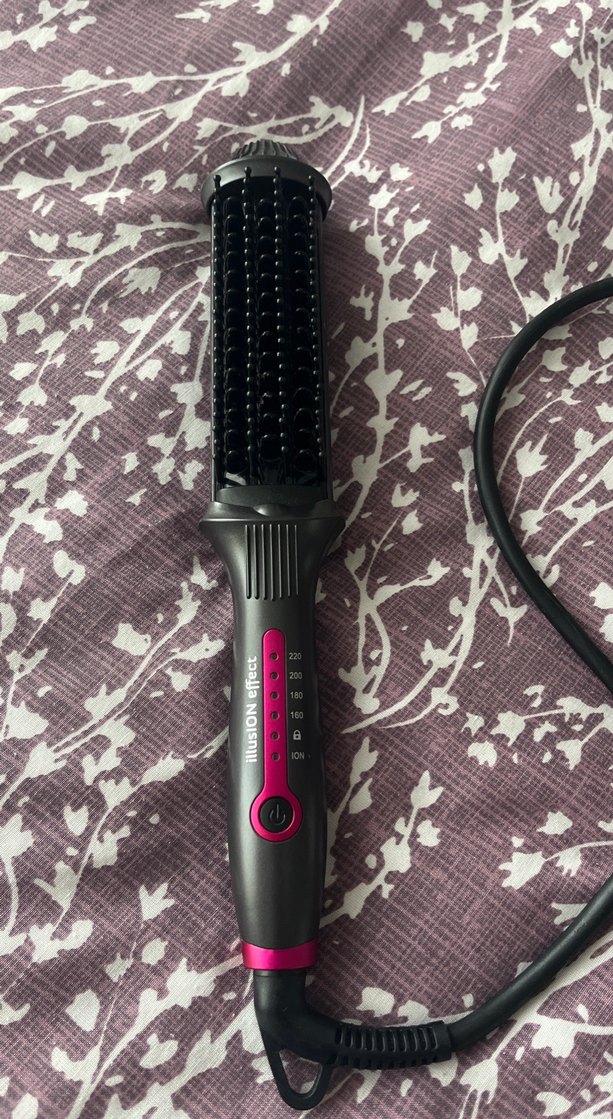 Koyu pembe saç düzleştirici fırça, kolay kullanım için ergonomik sap ve ayarlanabilir ısı ayarlarına sahiptir. Döner kablo ile konforlu kullanım sağlar. ♀️