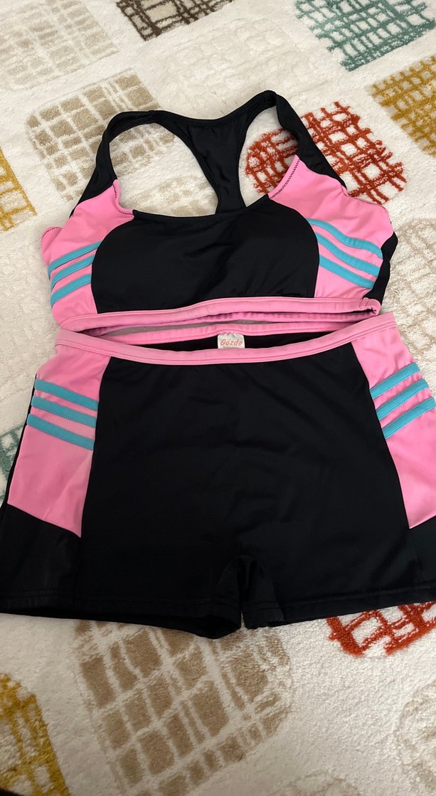 Pembe ve siyah renklerde, ince askılı üst ve kuşaklı kısa şortlu, spor ve sokak stiline uygun kadın mayo takımı.
