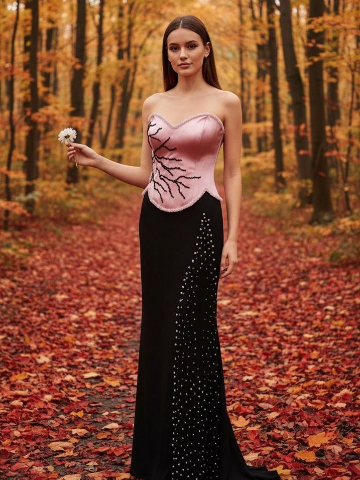 Pembe drapeli straplez üst kısmı ve siyah, taşlı uzun etek kısmıyla, fitted kesim abiye elbise. Kolsuz ve düğün için uygun.