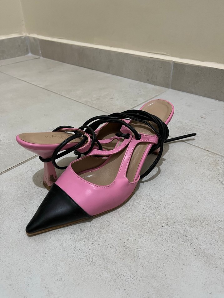Bu kadın ayakkabısı, pastel pembe ve siyah renklerde, yılan derisi desenli ve tokalıdır. Stiletto topuklu, kauçuk malzemeden modern bir görünüme sahiptir. Bağcıklar bileğe bağlamalıdır bir iki kere giyildi