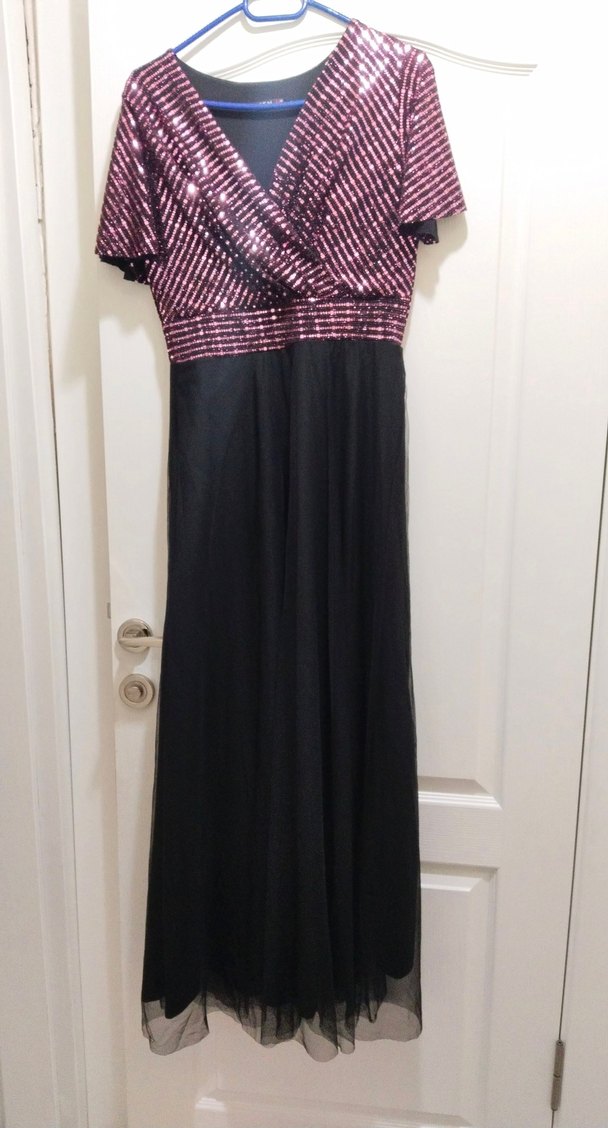 Pembe batik desenli üstü drapeli, V yakalı, askılı kollu, siyah uzun etekli, rahat kesim gotik tarz elbise. Romantik akşamlar için uygundur.