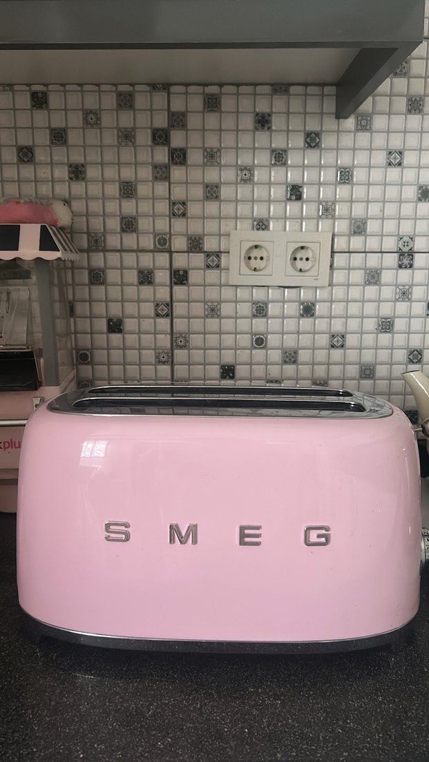 Pastel pembe renkli SMEG marka, retro tasarımlı ekmek kızartma makinesi. İki dilim ekmek için yuvalı ve krom detaylı. Önde M, E, G harfleri yer alıyor.