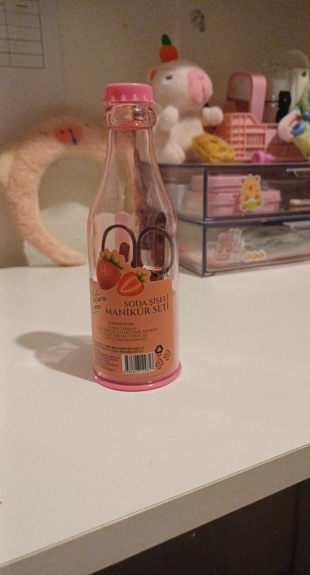 Pembe pastel renkte, çilek desenli soda şişesi biçiminde kompakt ve dekoratif manikür seti.