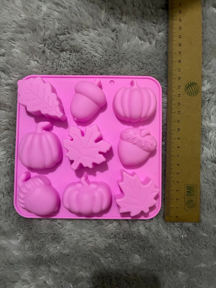 Pembe silikon kek kalıbı, yaprak, kabak, meşe palamudu ve çilek gibi sonbahar temalı figürler içerir. Pastel renk, esnek ve kullanımı kolaydır.