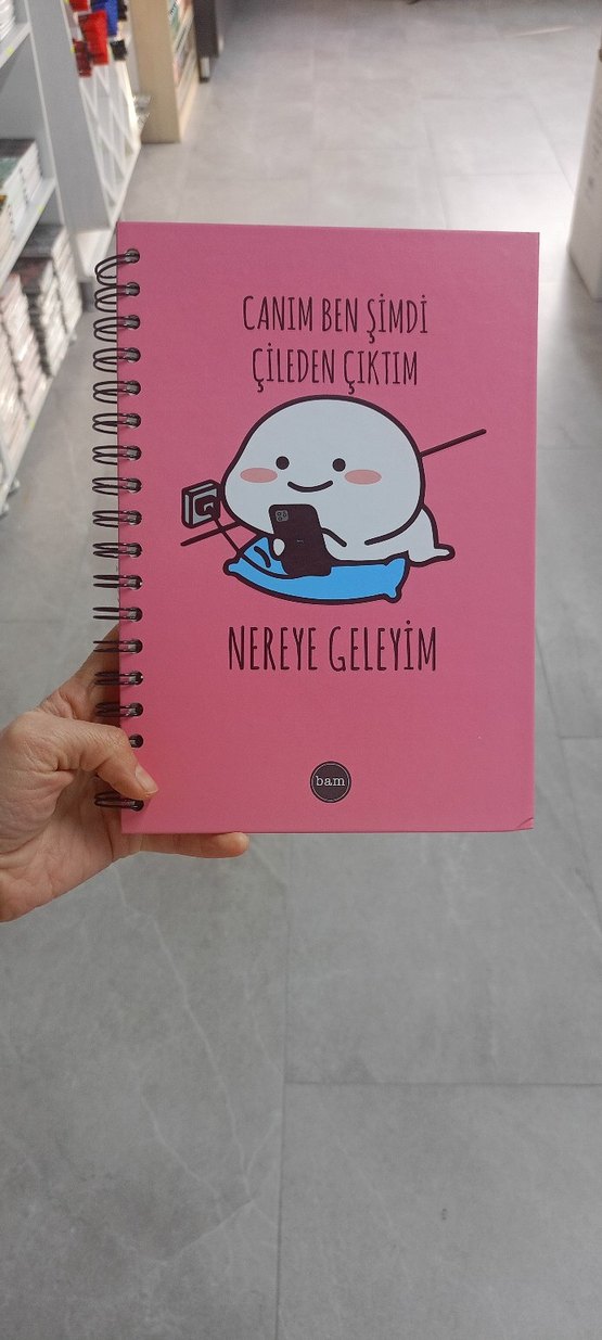 Pembe pastel kapaklı, spiralli defter. Üzerinde sevimli bir karakter ve "Canim ben şimdi çileden çıktım, nereye geleyim" yazısı bulunur.