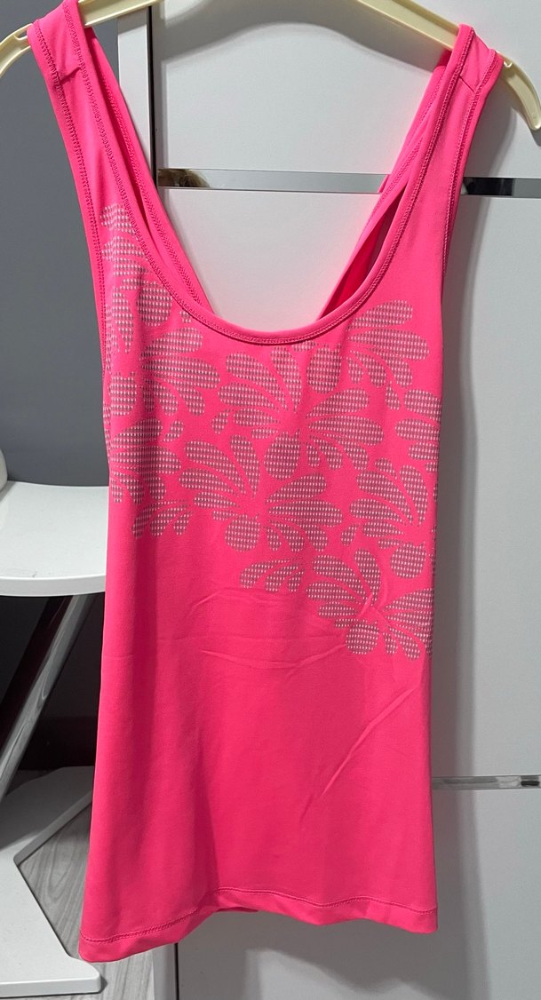 Pembe, arkası çarpraz askılı, baskılı çiçek deseni ile sportif ve sokak modasına uygun, sentetik kumaştan yapılmış, normal boy, kadın spor atlet. Arkası gerdirilerek model gösterilmiştir.