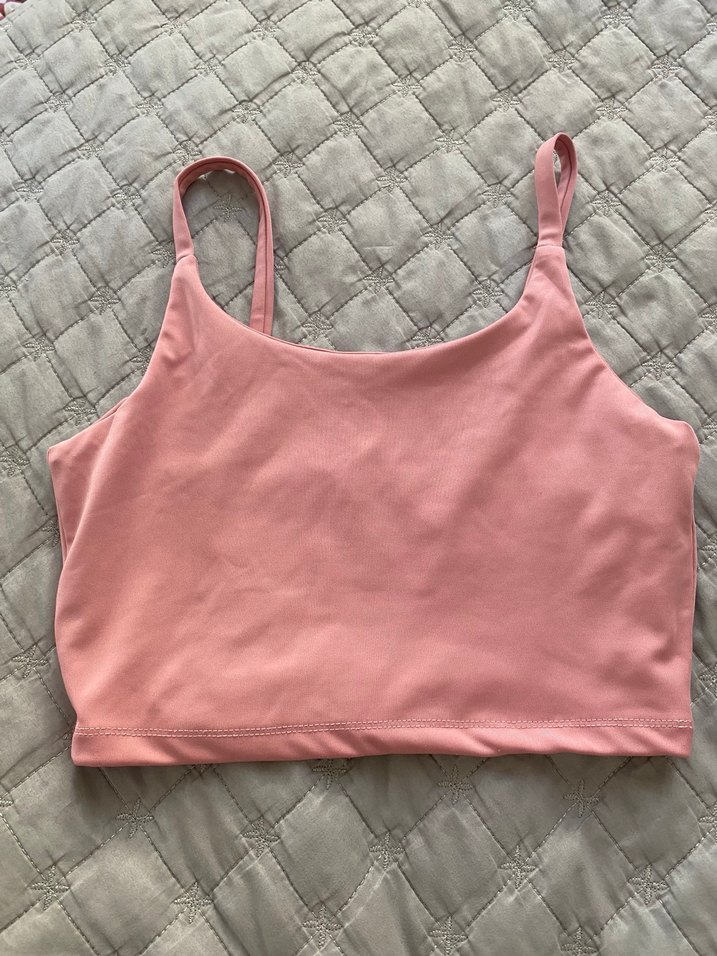 İnce askılı, pastel pembe renkli, sade tasarımlı spor sütyeni, athleisure ve street wear tarzları için uygundur.