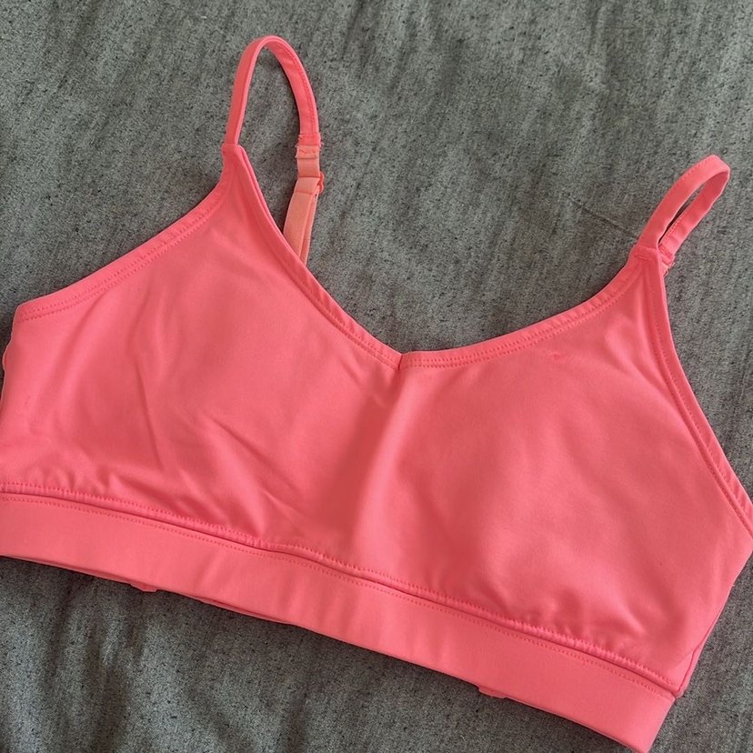 Ayarlanabilir askılı, desensiz pembe spor sütyeni. Canlı renkte, normal boyda, rahat sokak stili için uygun.