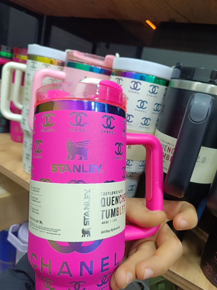 Renkli pembe Stanley Quench Tumbler, tutma sapı ve kapaklı. Chanel desenli, 40 oz (1,18 L) kapasiteyle gün boyu su tüketimi için uygundur.