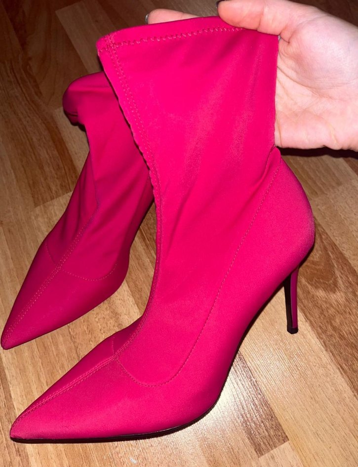 Pembe renkte, stiletto topuklu, elastik yapılı kadın botları. Yumuşak sentetik kumaştan üretilmiş, cesur ve çağdaş tasarıma sahip.
