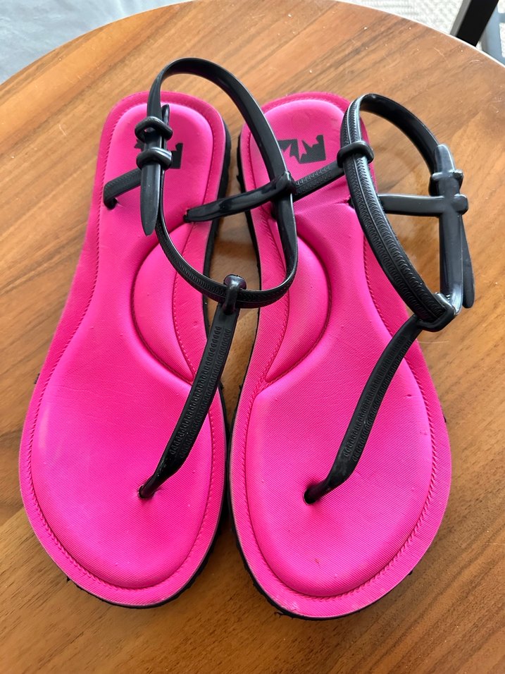 Pembe kauçuk tabanlı, siyah tokalı bantlara ve stiletto topuğa sahip kadın sandaletleri, sportif ve avangart tarzı bir araya getiriyor.