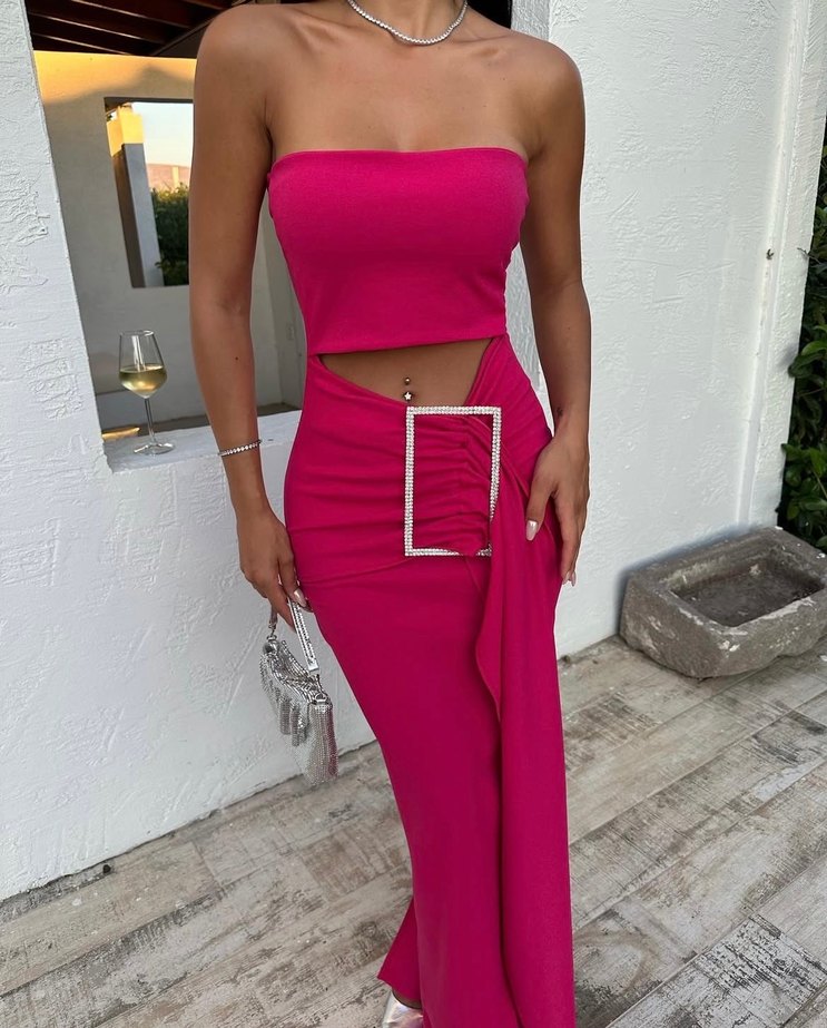 Pembe strablez uzun elbise, kemer detayıyla ve ipeksi kumaşıyla dikkat çeker. Regular fit ve ince askılarla outdoor sokak modasına uygundur. Çanta hediyeli