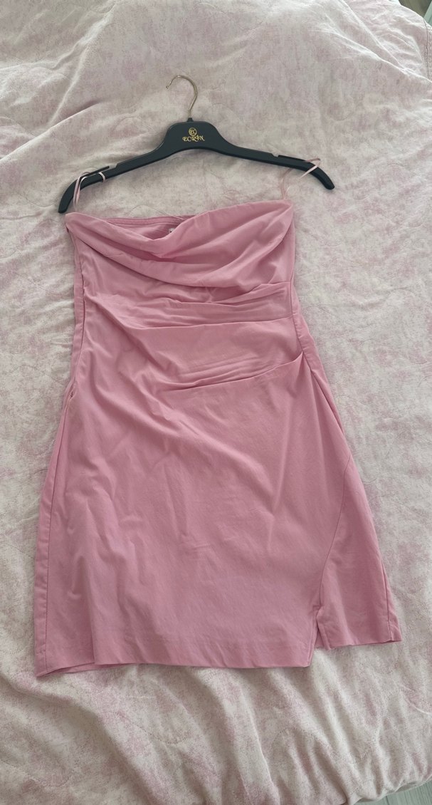 pembe straplez mini elbise