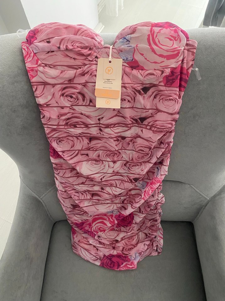 Pembe tonlarda baskılı gül desenli, straplez ve drapeli uzun abiye elbise. Kolsuz ve vücuda oturan kesimiyle romantik geceye uygun, çağdaş Paris tarzı. Hiç kullanmadım etiketi üstünde M-L uyumlu