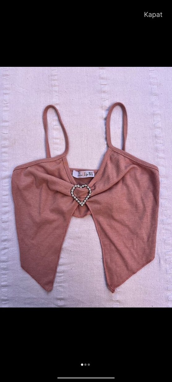 İnce askılı, kalp şeklinde tokası olan triko crop top. Normal boyda ve midi kesime sahip, pastel pembe renkte, rahat sokak stili için uygun.