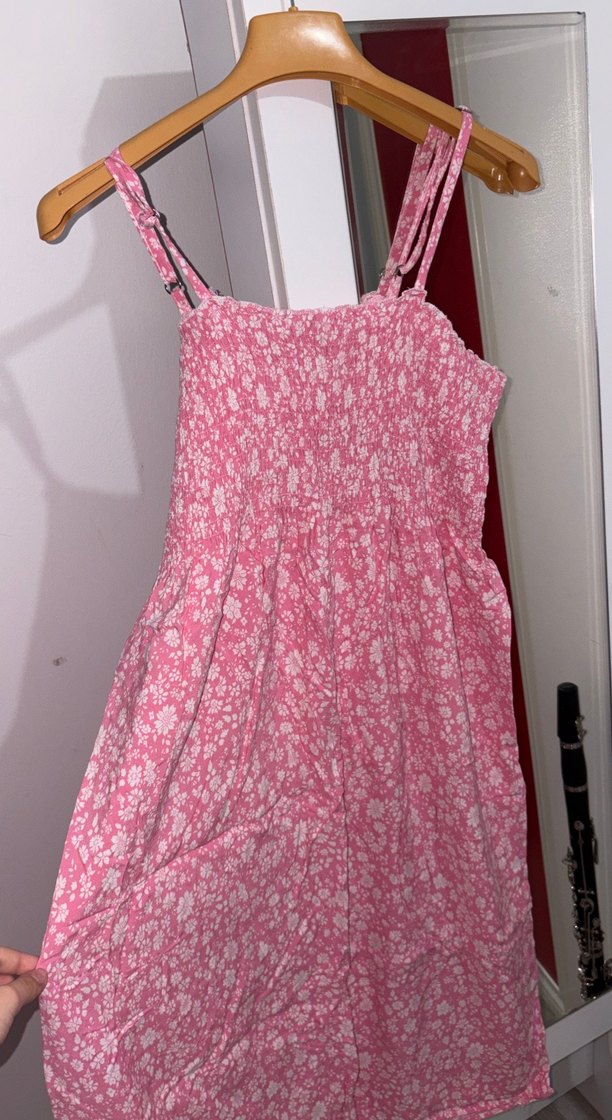 Pembe, straplez yakalı, bohem tarzda midi elbise. Pastel tonlarda bağlama desenli, ince ve yumuşak kumaştan, bele oturan kesime sahip.