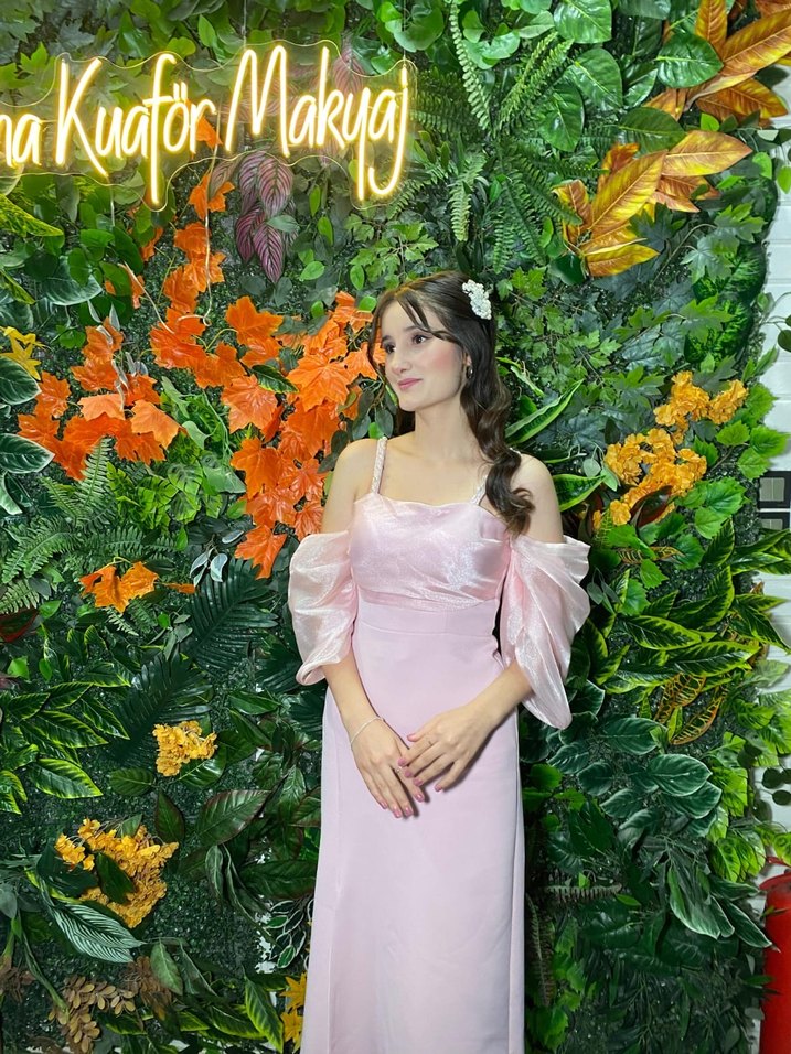 Pembe pastel tonlarda, straplez yaka ve drapeli, askılı kollarıyla bohem ve şık uzun elbise.