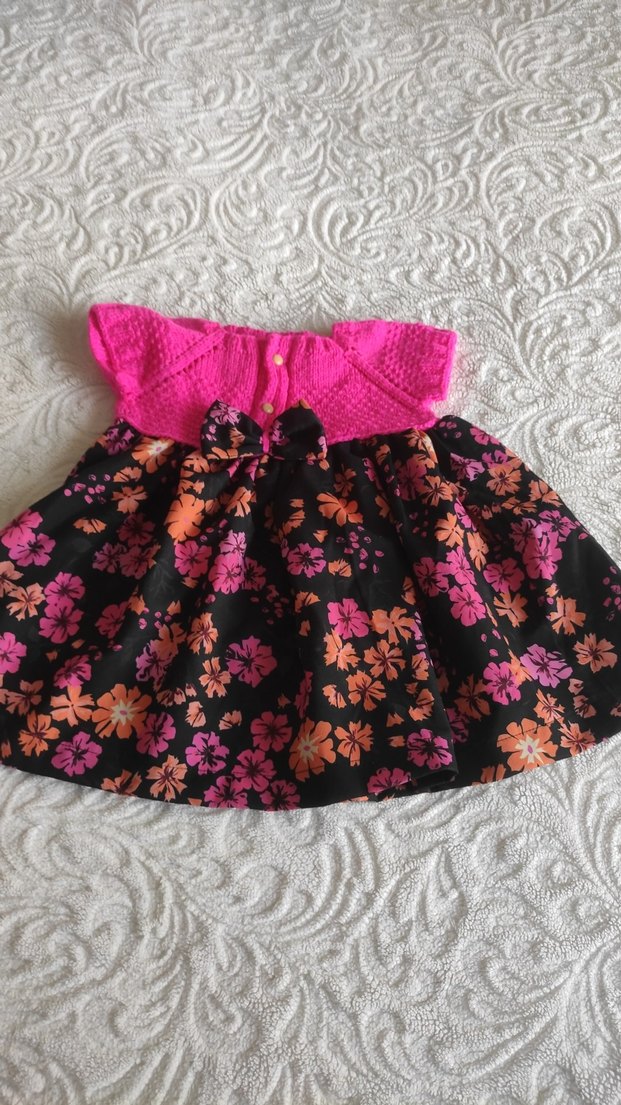 Pembe örme, volanlı üst kısmı ve renkli çiçek desenli etek kısmıyla, bol kesim bohem tarzda kız çocuk elbisesi.